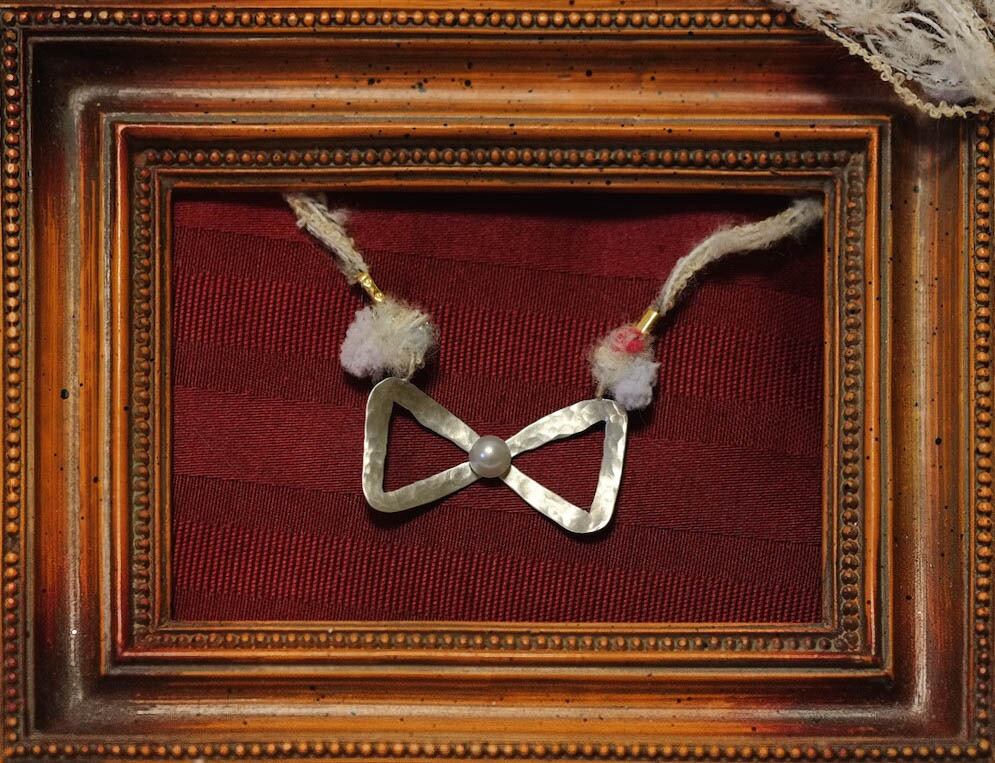 シルバーを叩いてリボンの形に形成したので味のある形に仕上がりました。